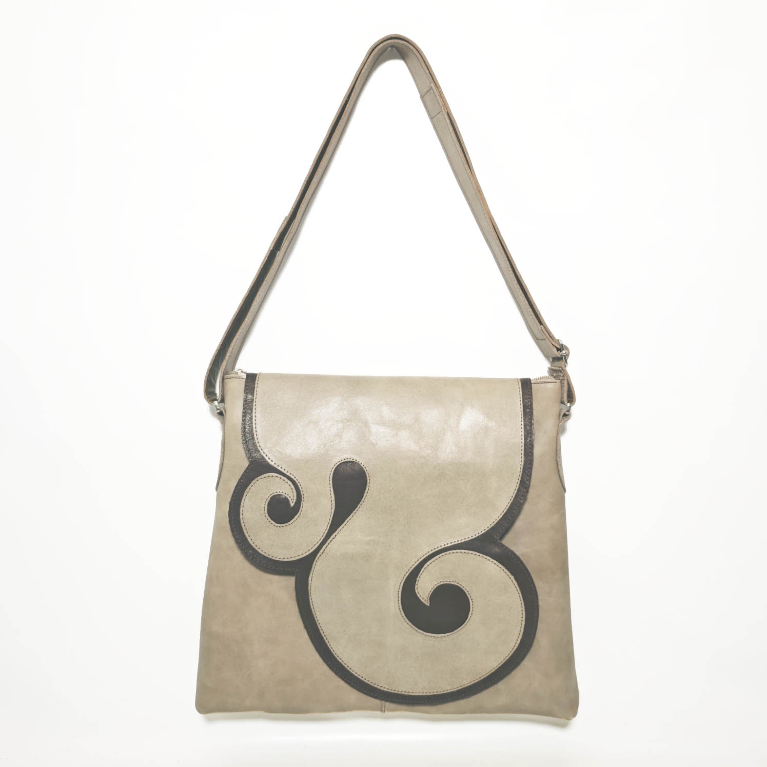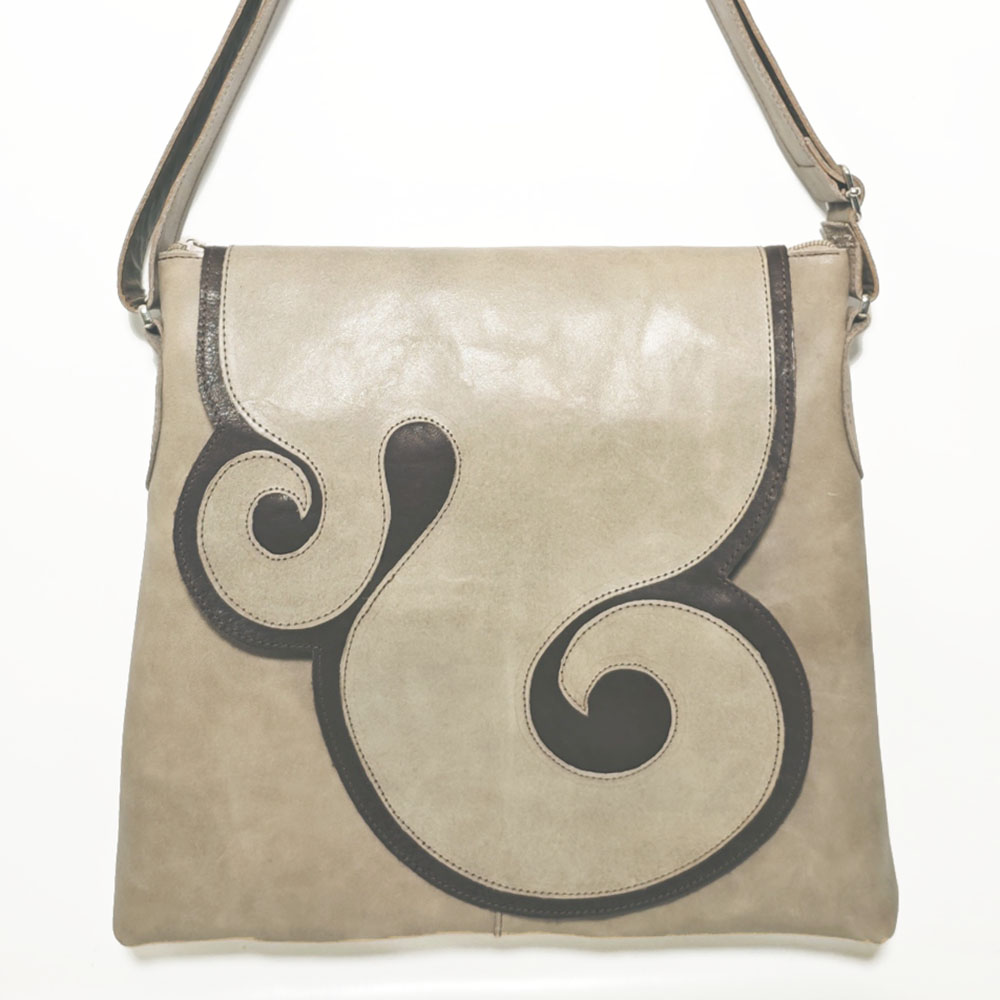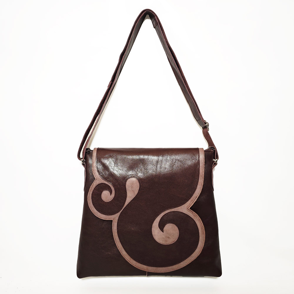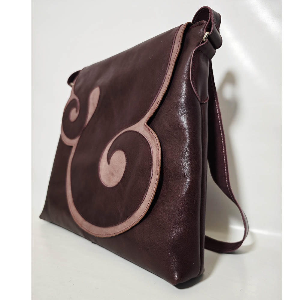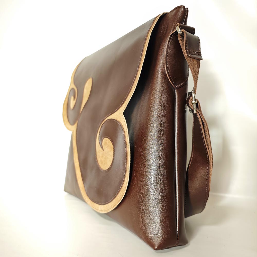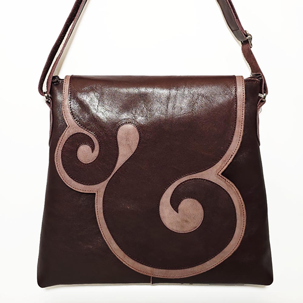 Bolso con solapa de espirales de piel de primera calidad, de fabricación artesana.