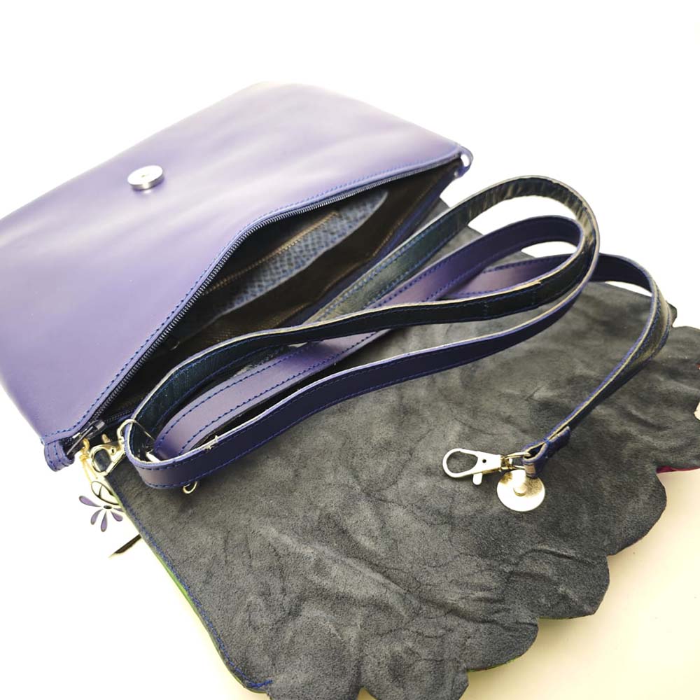 Bolso  único de mano en  piel, de artesanía, pieza única  exclusiva e irrepetible, está elaborado artesanalmente en todo su proceso,  la solapa está modelada a mano en badana natural y teñida de forma exclusiva con un degradado de colores.