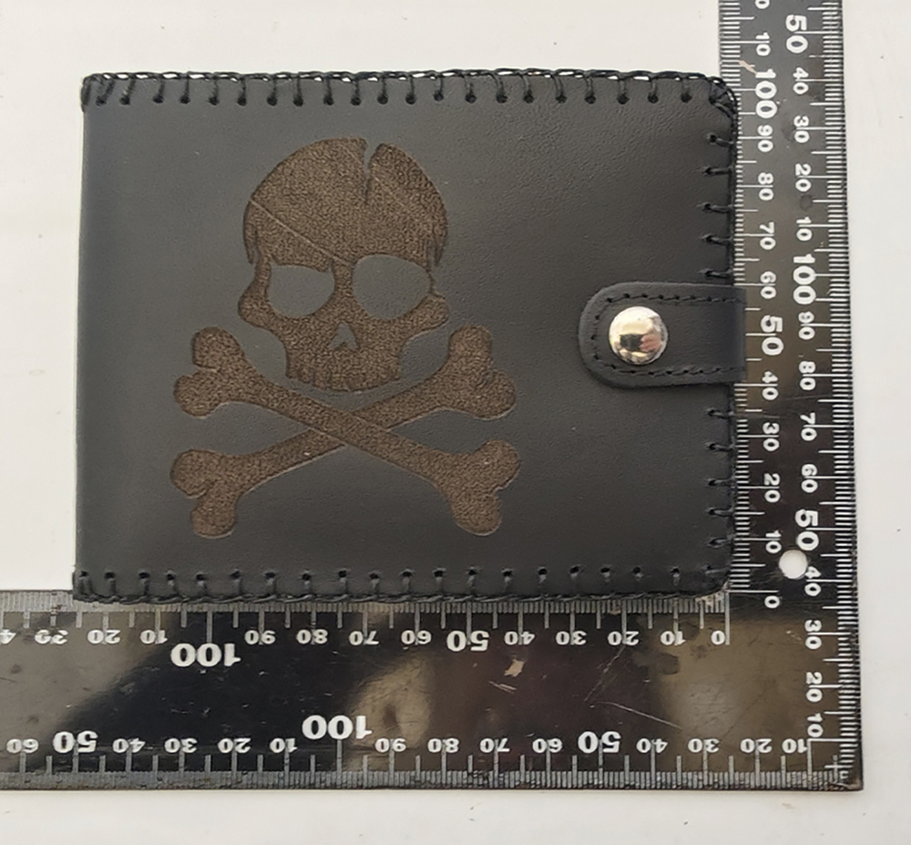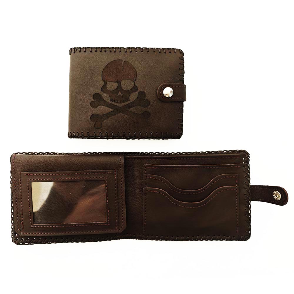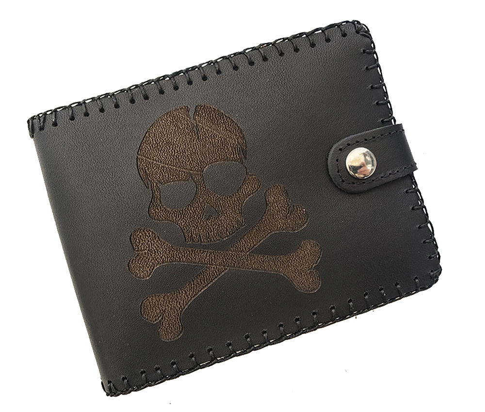 Billetero de cuero con monedero para caballero. Con grabado de calavera.