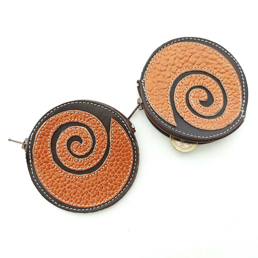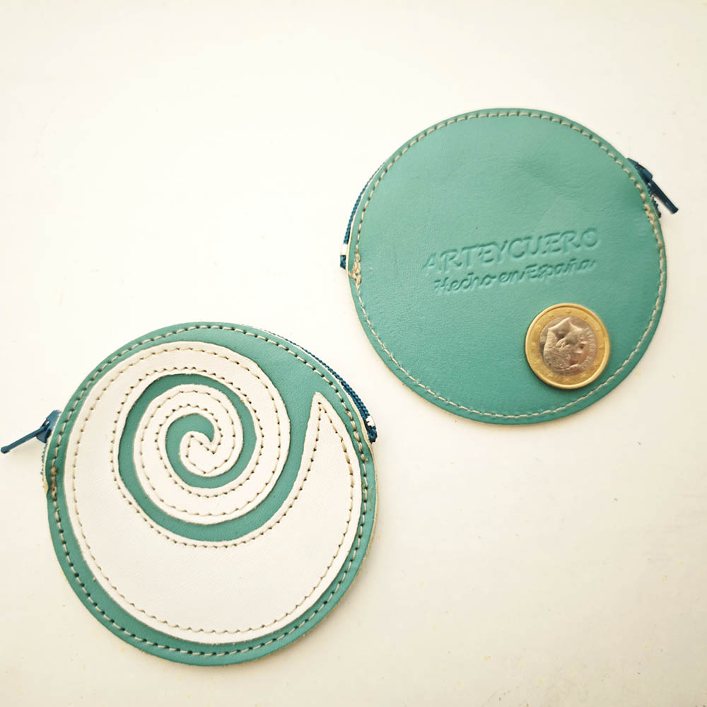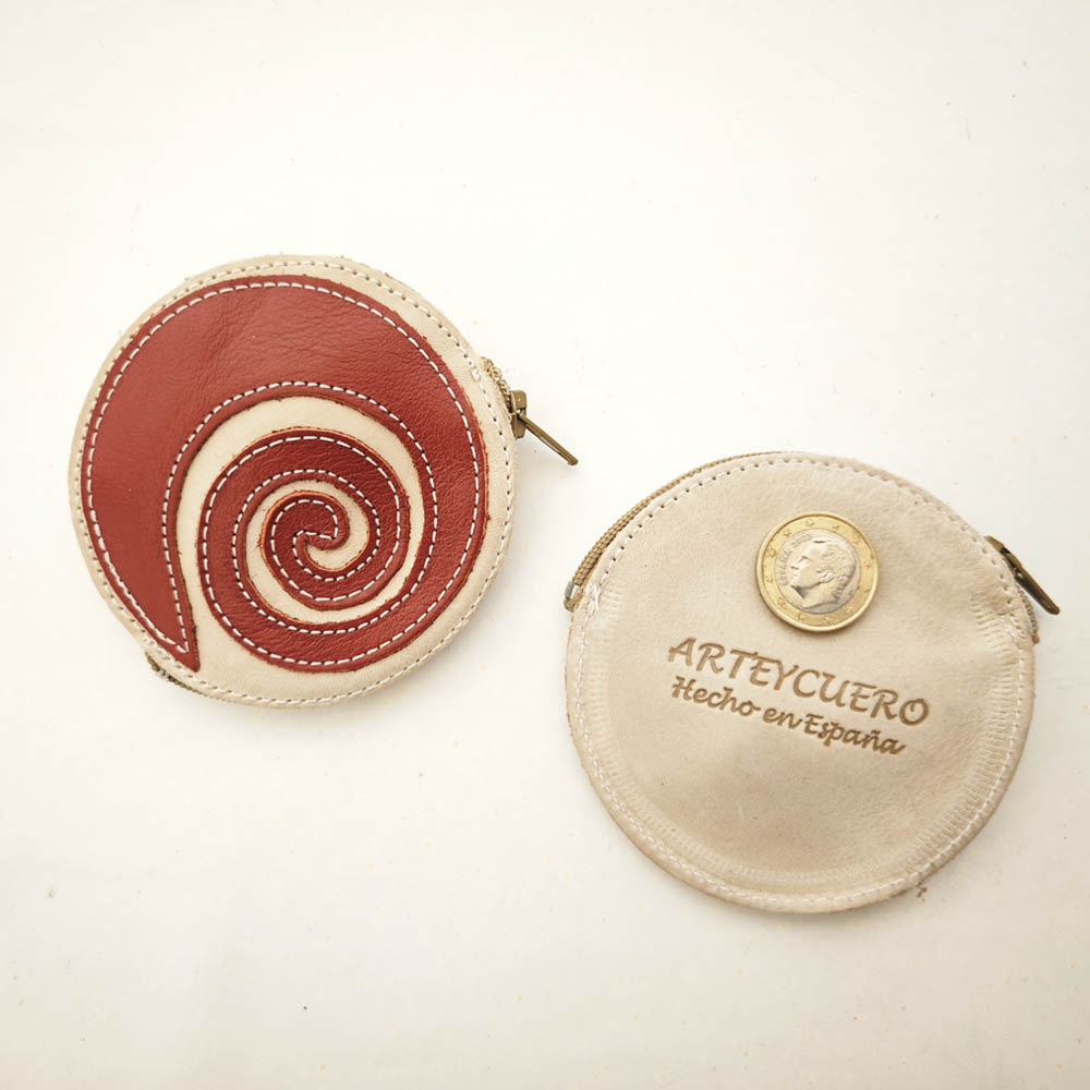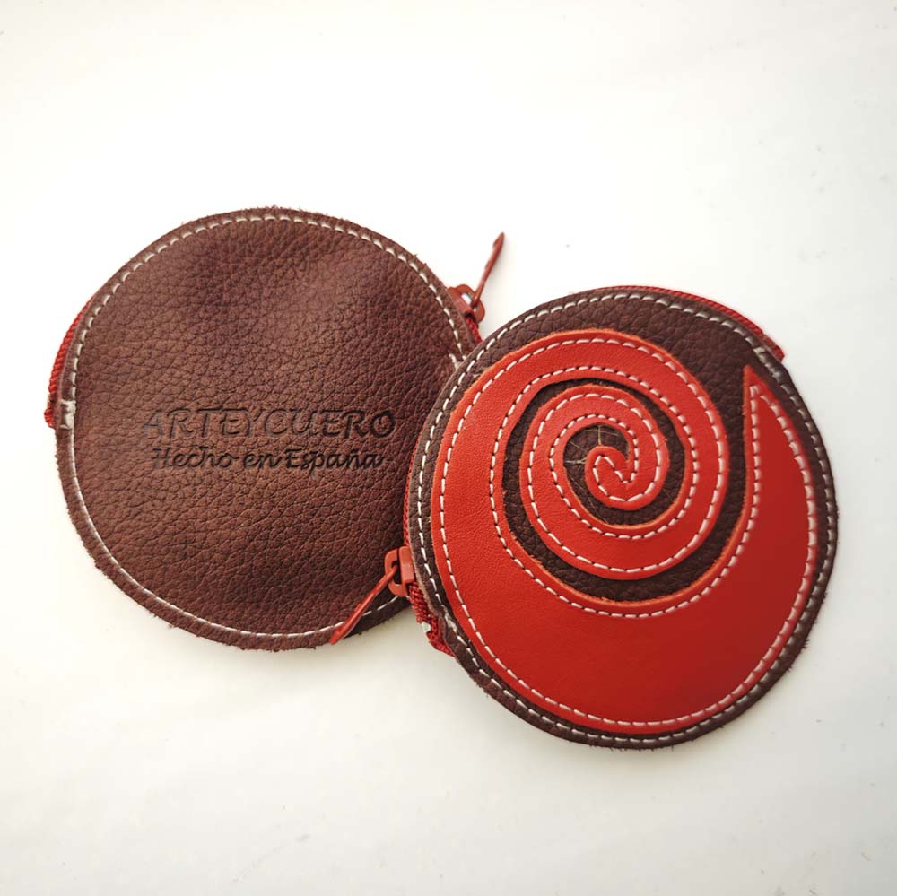 Monedero de piel de primera calidad, con forma redonda, cierre de cremallera y adorno de espiral cosida.