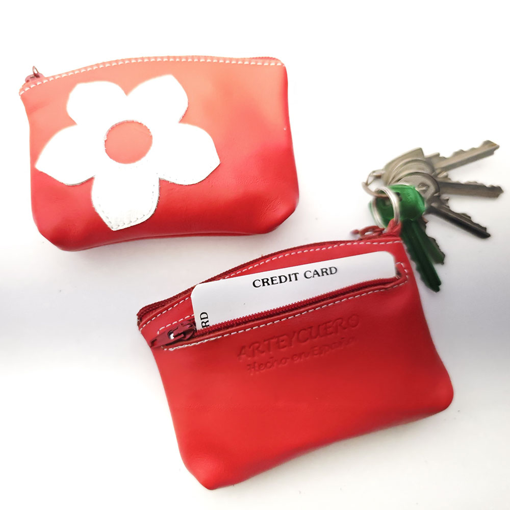 Portamonedas de piel con cremallera y anilla para llaves. Con cierre de cremallera y bolsillo trasero también con cremallera.
