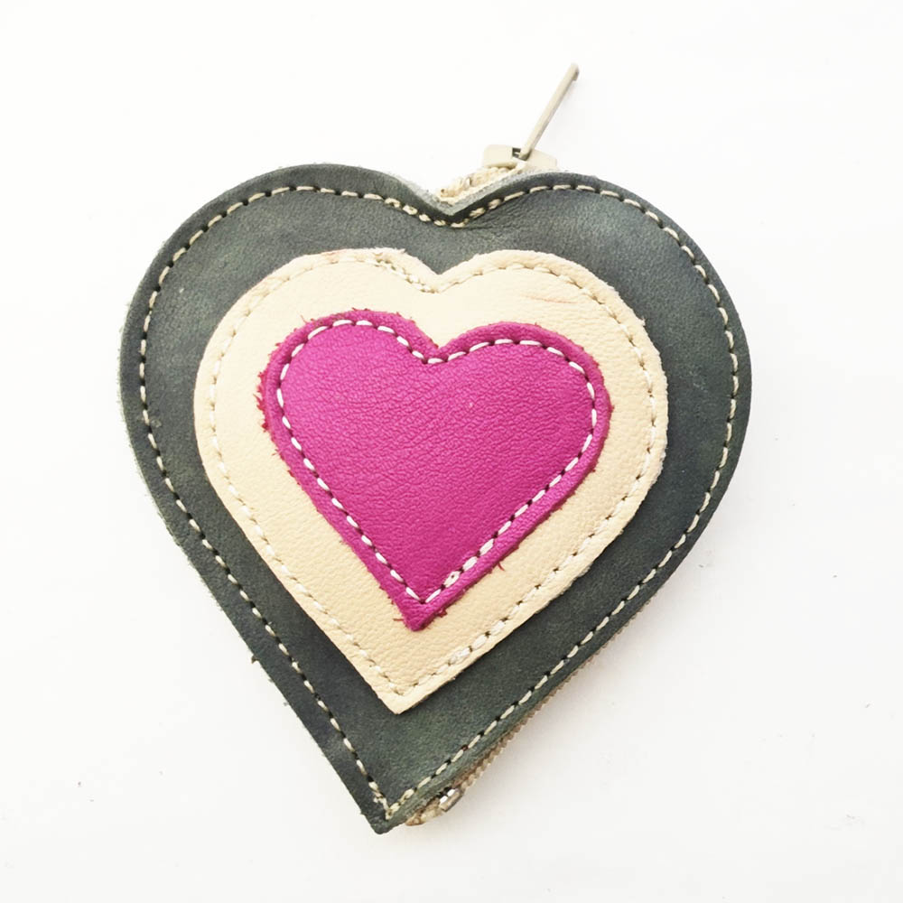 Monedero corazón en piel de divertidos colores y atrevidas combinaciones. Cierra con cremallera y esta confeccionado en piel de primera calidad.