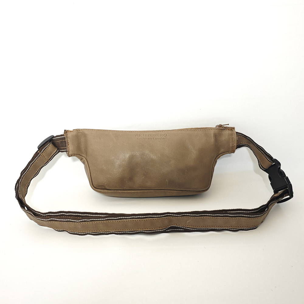 Está confeccionada en genuina piel y cierra con cremallera,  la correa es ajustable y tiene hebilla de plástico a un lateral para facilitar el uso.